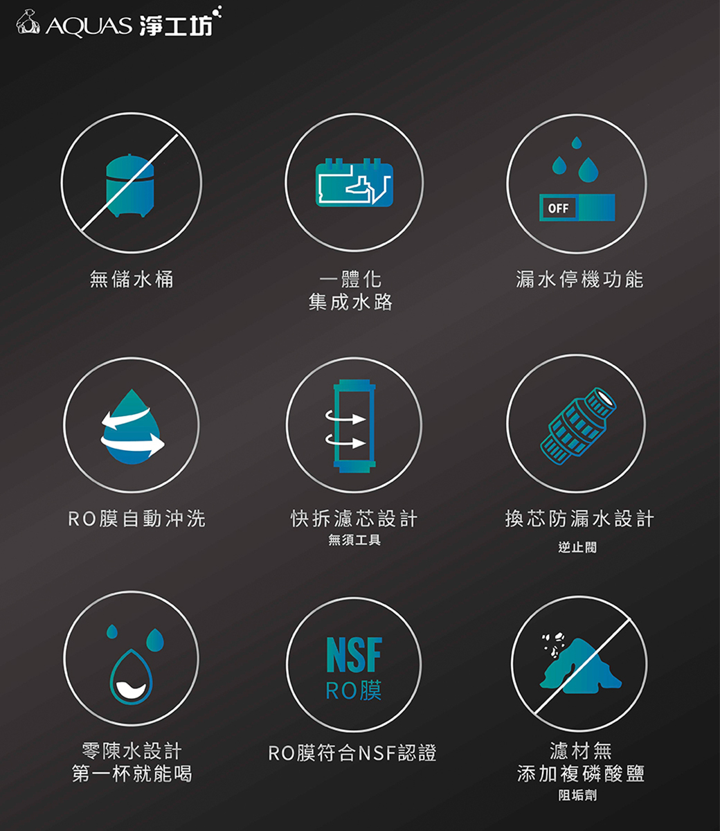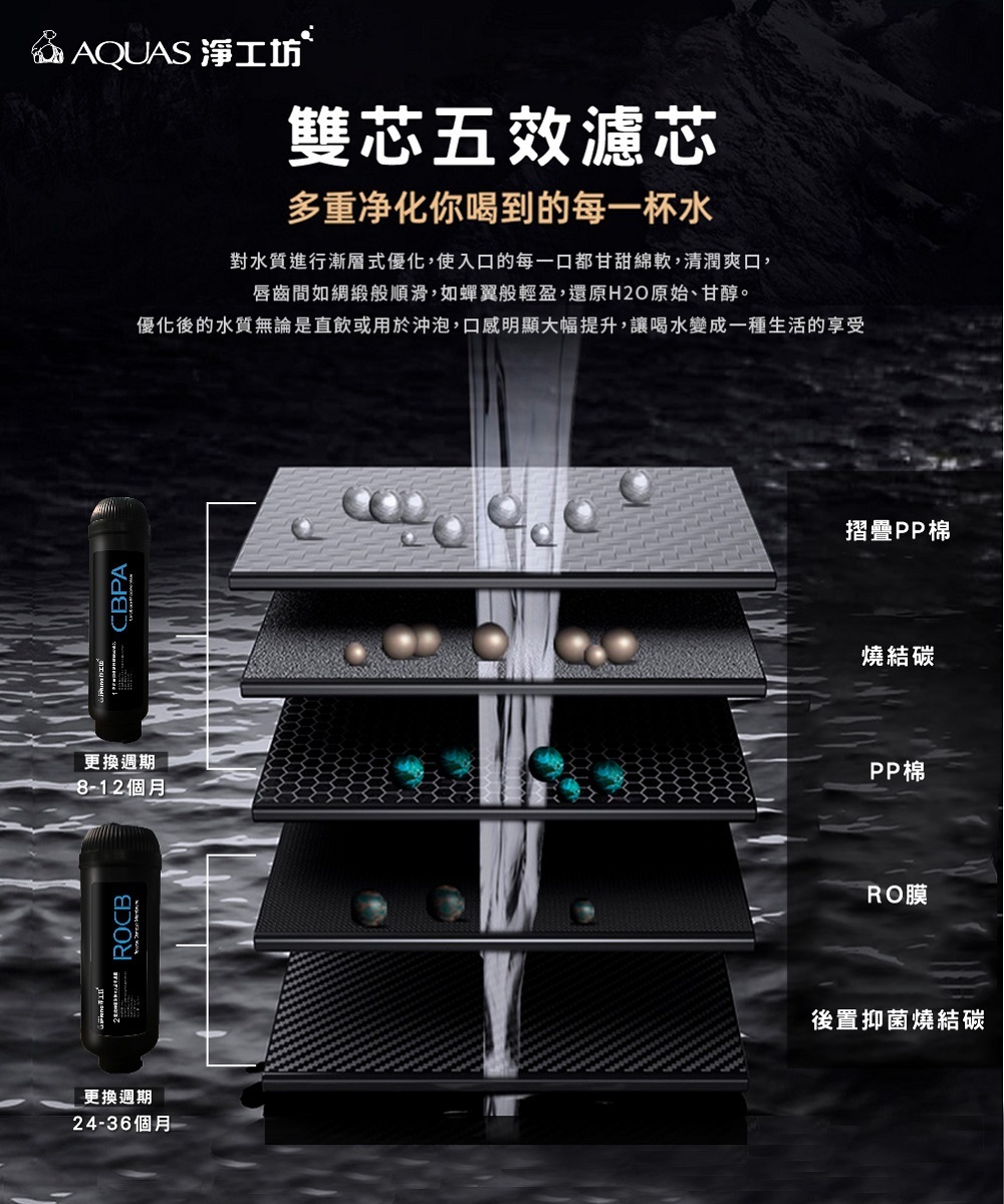 ․使用TORAY東麗RO膜、斯里蘭卡椰殼活性碳,濾材不添加複磷酸鹽,