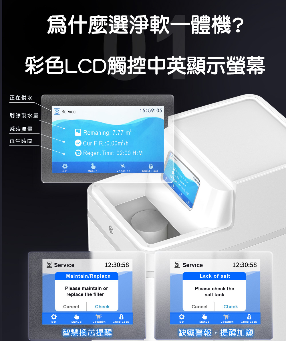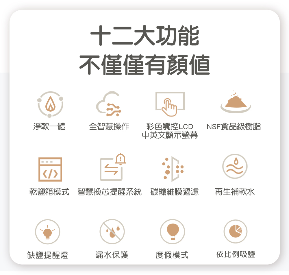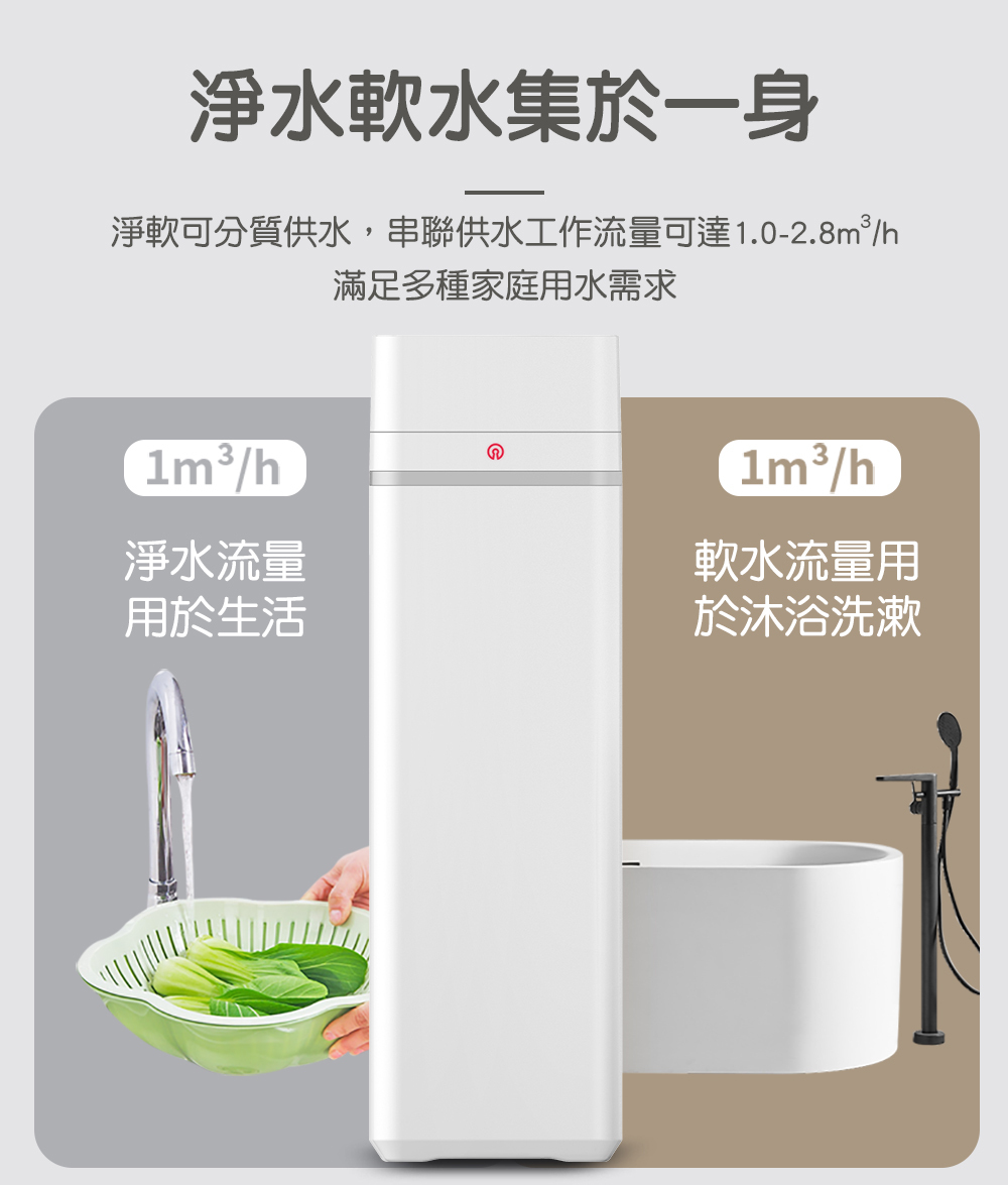 ․淨軟一體: 全自動智慧化運行,採用碳纖過濾淨化和食品級陽離子樹脂對原水進行軟化,有效降低自來水水中餘氯、鈣和美等離子的含量