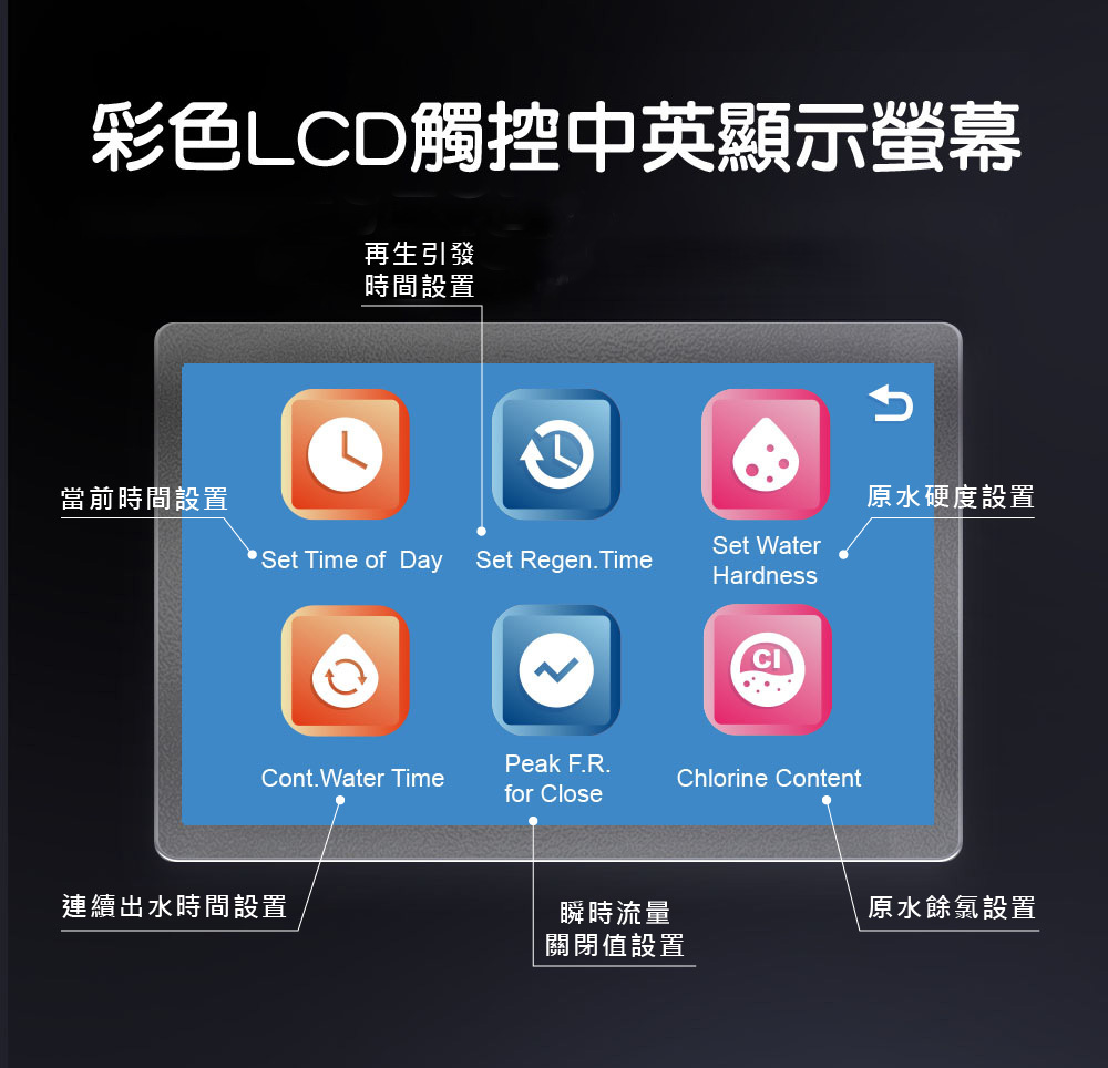 ․硬度調節閥、流量偵測計: 配置旁通閥,軟水、混水、旁通任意選擇