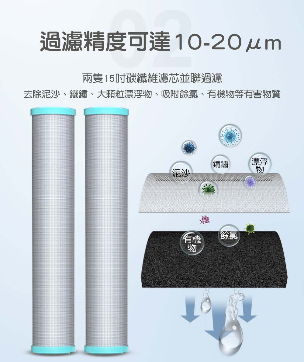 ․碳纖過濾的吸附能力,對水中雜質進行過濾吸附處理,能去除水中的異味、餘氯,改善水的口感。去除化學物質、農藥,無化學接合劑