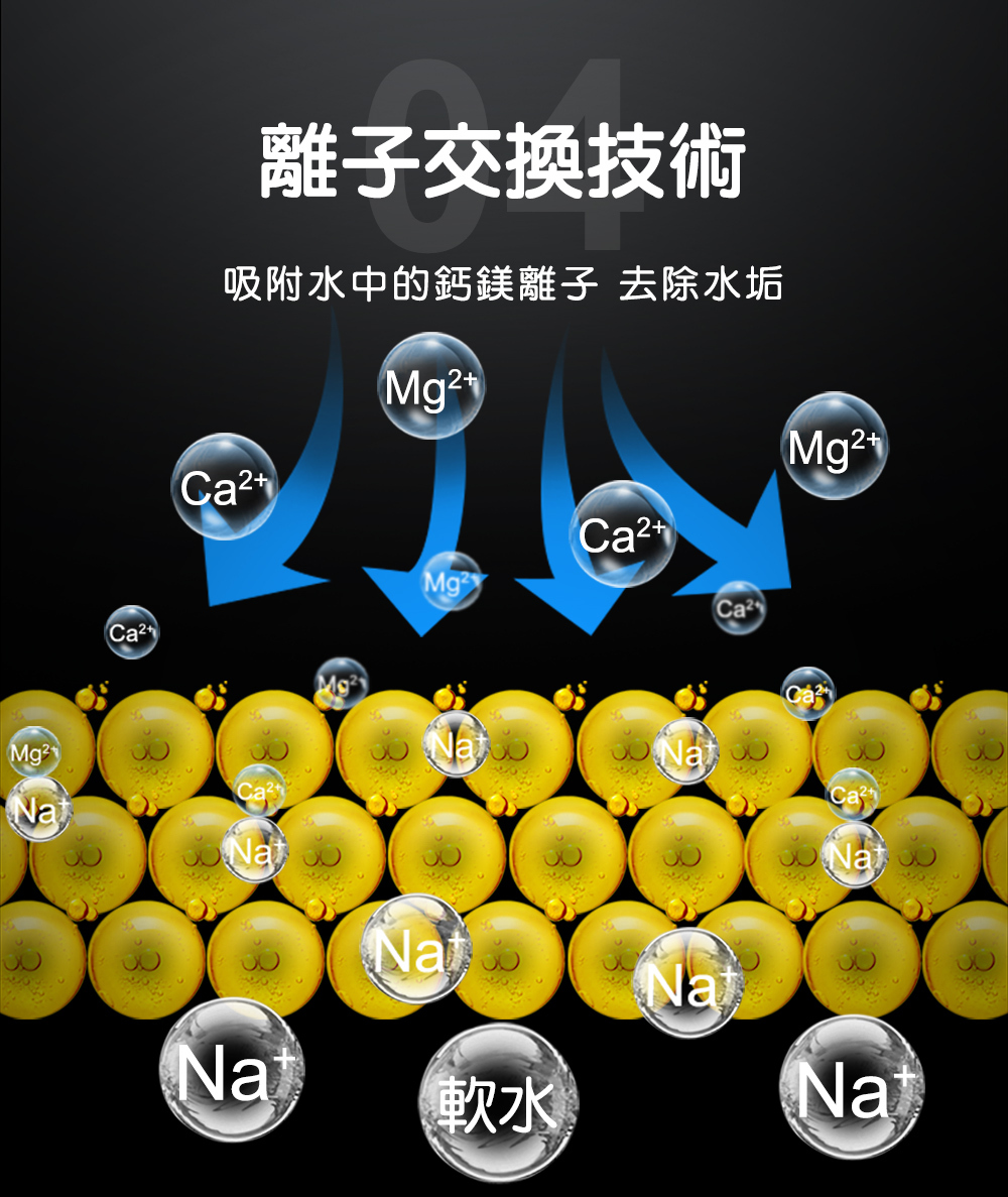 ․應用離子交換技術,通過樹脂置換水中的鈣、鎂等離子,達到去除水垢(碳酸鈣、碳酸鎂)、重金屬